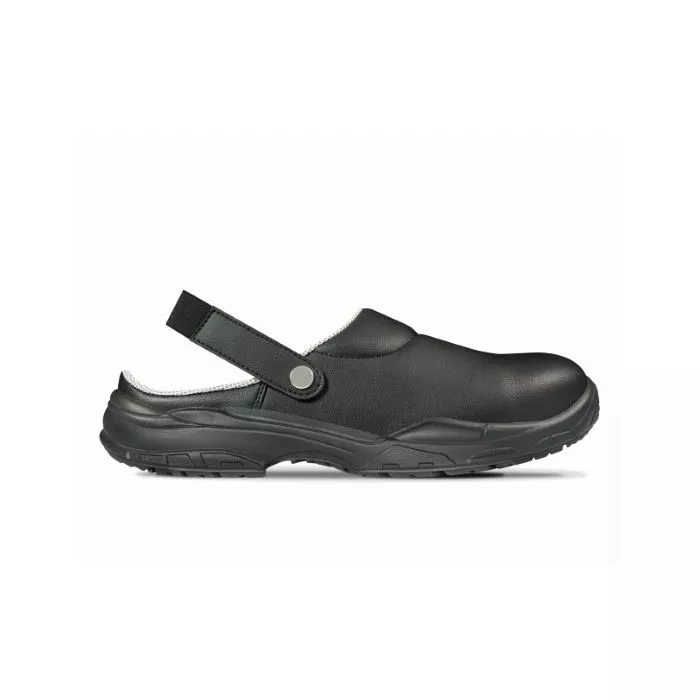 Sabot con collo del piede imbottito, cinturino elasticizzato chiuso con bottone automatico, soletta estraibile e antistatica, puntale in composito e suola in poliuretano monodensità.